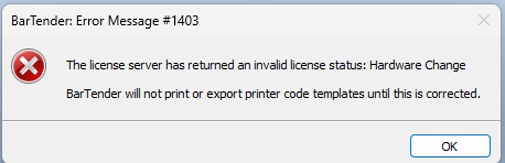 This error means BarTender has detected significant hardware changes, such as a new motherboard or Windows update, that have invalidated your license. To fix it, you can deactivate and reactivate the license through the BarTender Administration Console. If that doesn't work, you may need to restart the BarTender Licensing Service in Windows Services or repair/reinstall the application