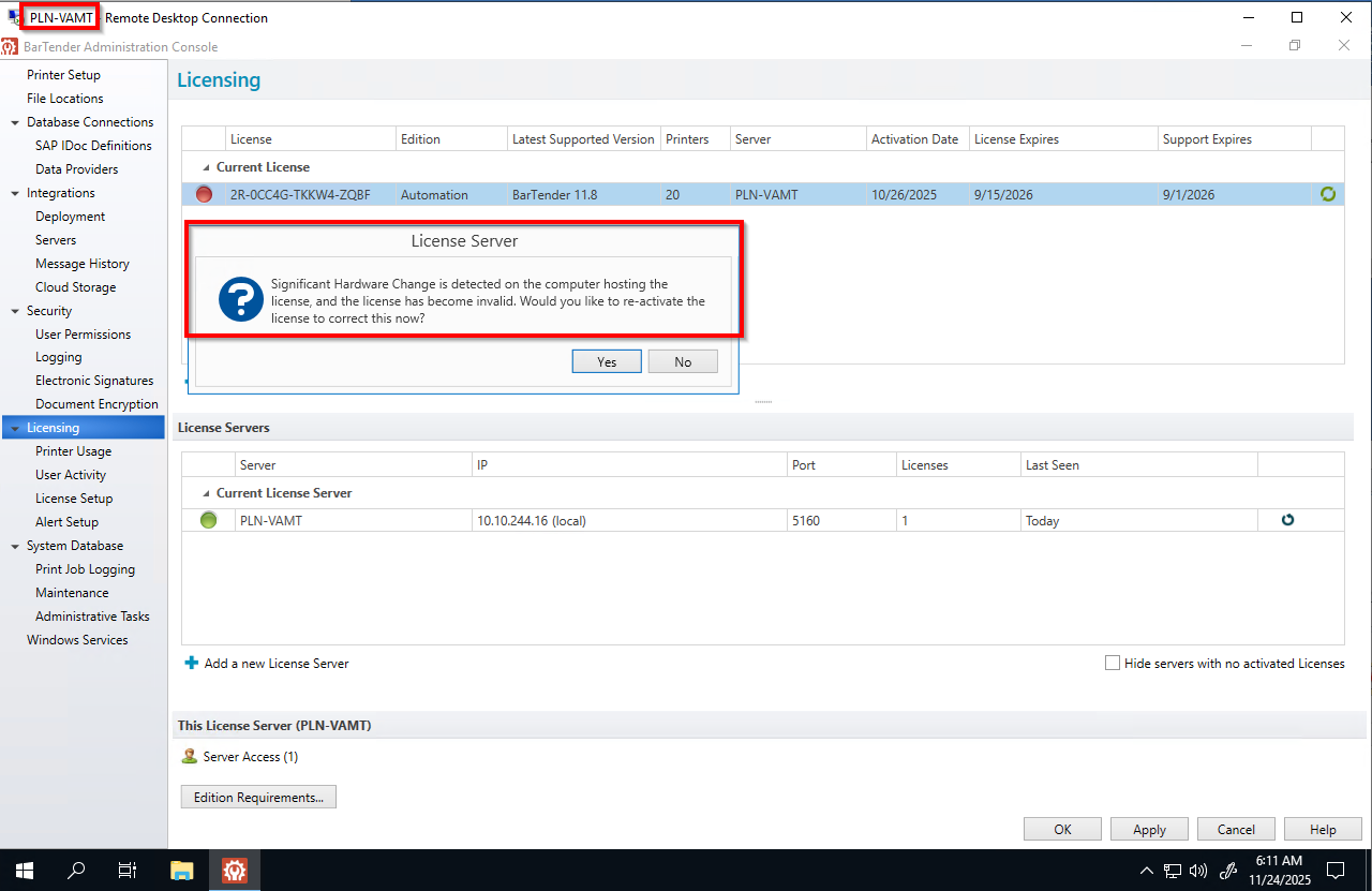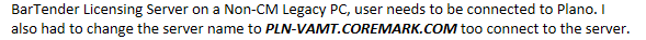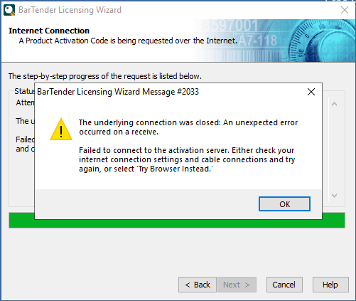 *** Rare issue with the BarTender Licensing server itself ***