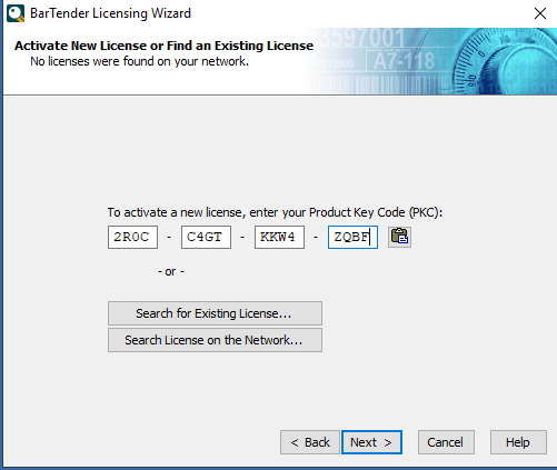 When Bartender opens…click on Search for existing license