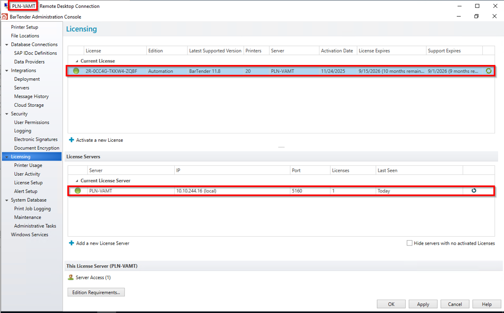 Licensing Server now shows valid activated license